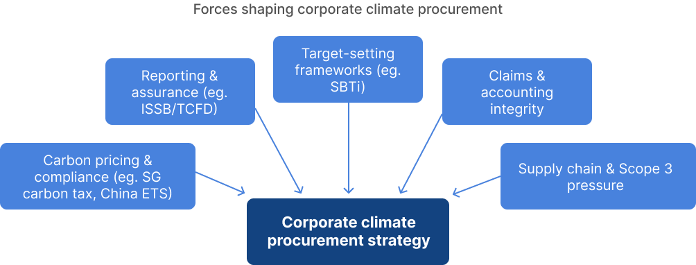 This determines whether the comapany needs carbon credits, RECs, or both, as well as the timing and structure of procurement. Many companies therefore operate multiple procurement tracks simultaneously — for example, renewable electricity procurement for Scope 2 and carbon credit procurement for residual emissions.