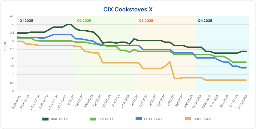 Over the course of 2025, the CIX Cookstoves X (CCX) benchmarks trended materially lower across all contract categories, with widening intra-year fragmentation driven by jurisdiction and standard.