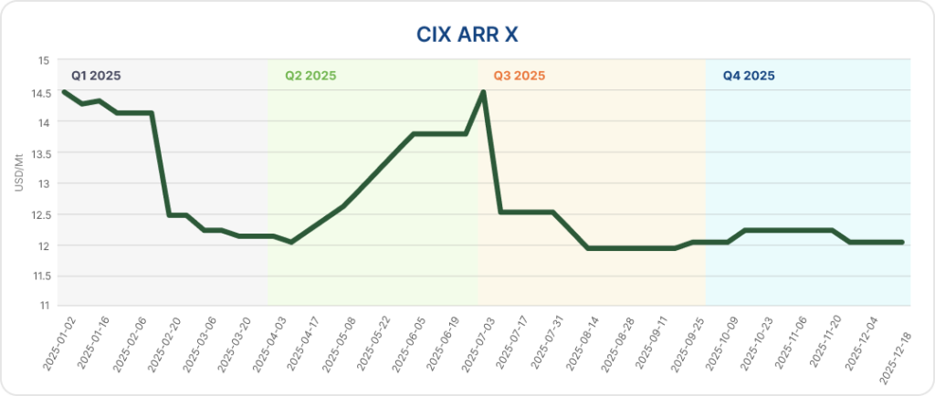 Over the course of 2025, the CIX ARR X (CAX) benchmark traded within a relatively narrow range, fluctuating between approximately $12.00/mt and $14.50/mt. The benchmark reached its annual high near the end of Q2 at $14.50/mt, before retreating and stabilising around the $12.00/mt level through the remainder of Q3 and into Q4, reflecting a cooling in buyer urgency and softer secondary demand.