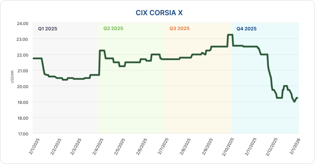 The CP1X benchmark continued to drift lower in December. On 1 December 2025, CIX launched its first standardised spot contract for CORSIA Phase 1 (CP1X-GM), supporting more transparent on-screen price discovery. Against a backdrop of muted buying interest, the benchmark softened further and settled in the mid-to-high $19s.