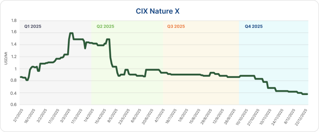 The CIX CORSIA Phase 1 X (CP1X) benchmark recorded an annual average price of US$21.45/mt in 2025. For most of the year, the CP1 market remained structurally tight, with limited spot supply and thin liquidity. As a result, benchmark movements were largely anchored to pricing for Guyana J-REDD+ (ART 102), oscillating in a $20.00-23.25/mt range from Q1 through Q3.