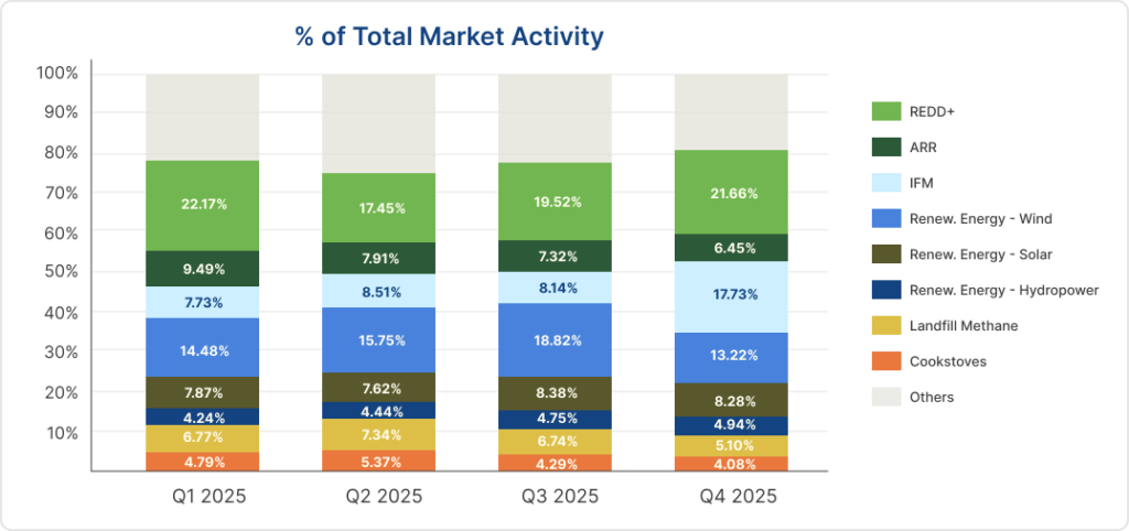 Landfill methane activity surpassed cookstoves in 2025 by roughly 2%p each quarter, flipping 2024’s trend and reflecting the market’s growing demand for quantifiable credits with potential for CCP labelling.