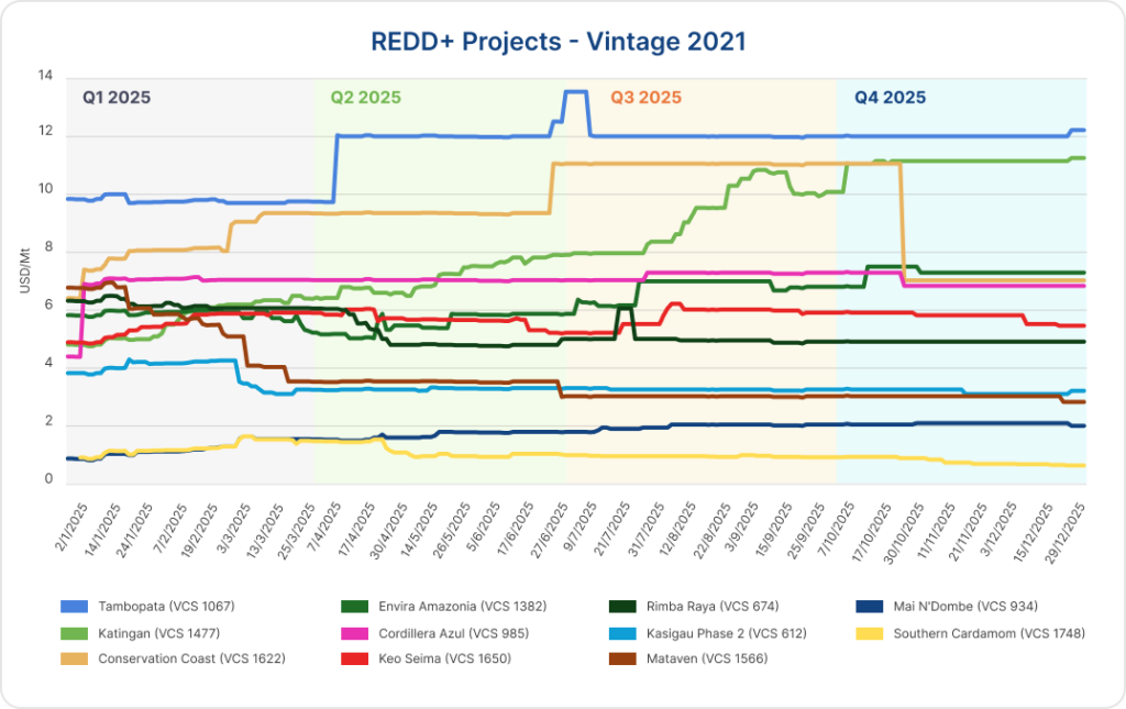 Tambopata assessed pricing increased from just under $10.00/mt to $12.00/mt in early Q2 and remained there throughout the year, with a brief uptick in early Q3. Katingan began the year in Tier 2 at $4.88/mt and climbed steadily through the year, reaching $11.00/mt by Q4 and holding that level into year-end. In Q3, Conservation Coast briefly entered Tier 1 with pricing at $11.00/mt, but this move proved temporary with prices retreating steeply in Q4.