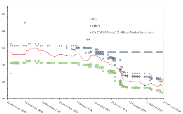 CIX CORSIA X benchmark alongside bids and offers on CIX spot contract ($ per ton)